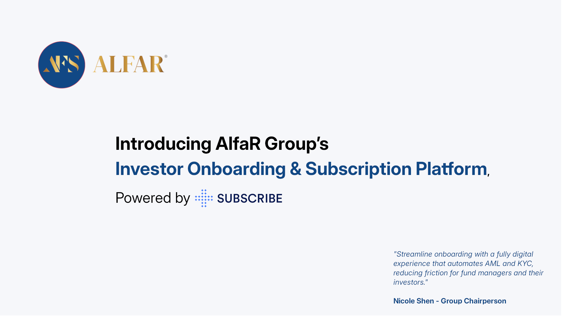 “Our Digital Investor Onboarding & Subscription Platform marks a key milestone in AlfaR’s technology-driven approach to fund administration,” said Nicole Shen, Group Chairperson of AlfaR Group. “By leveraging SUBSCRIBE’s capabilities, we deliver a seamless digital onboarding experience with robust AML/KYC processes, reducing friction for both fund managers and their investors.”