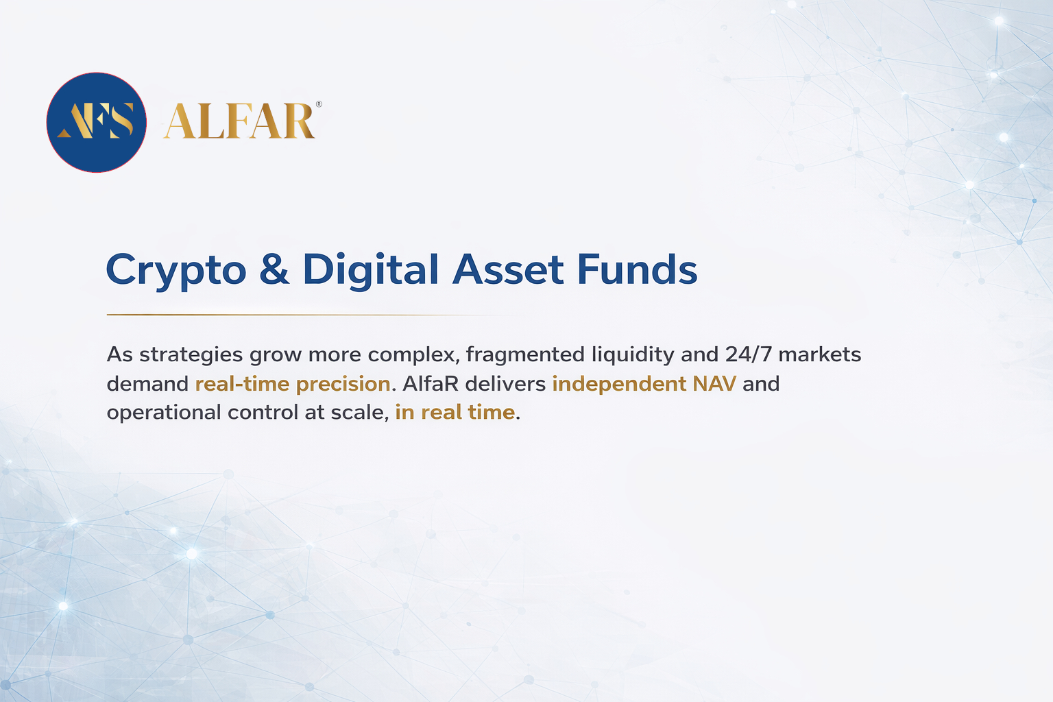 AlfaR provides the institutional infrastructure required to support this evolution, covering digital assets, stablecoins, DeFi exposures, and tokenized real-world assets within a single, disciplined operational framework.